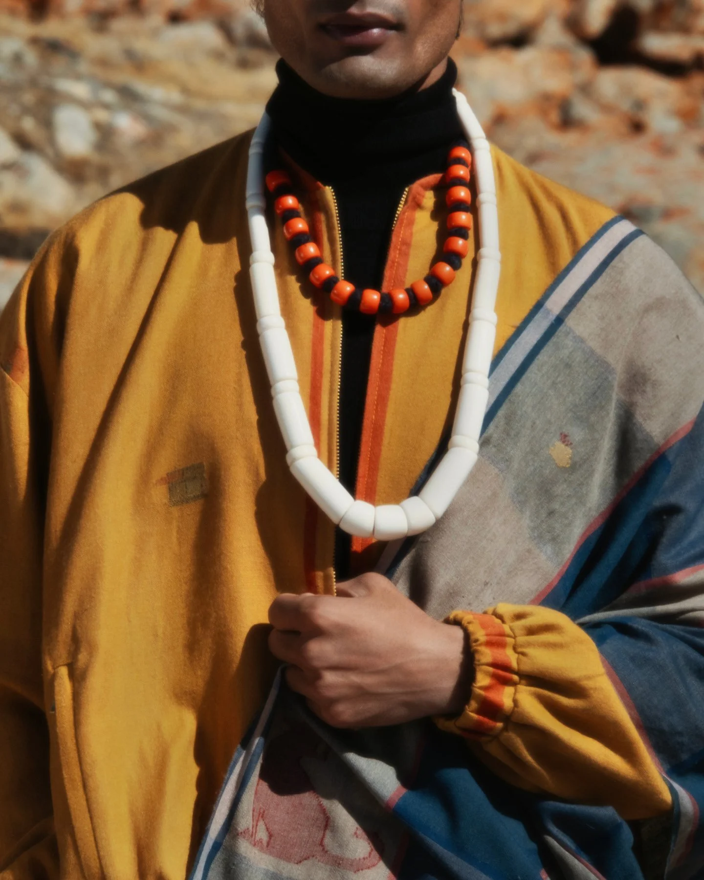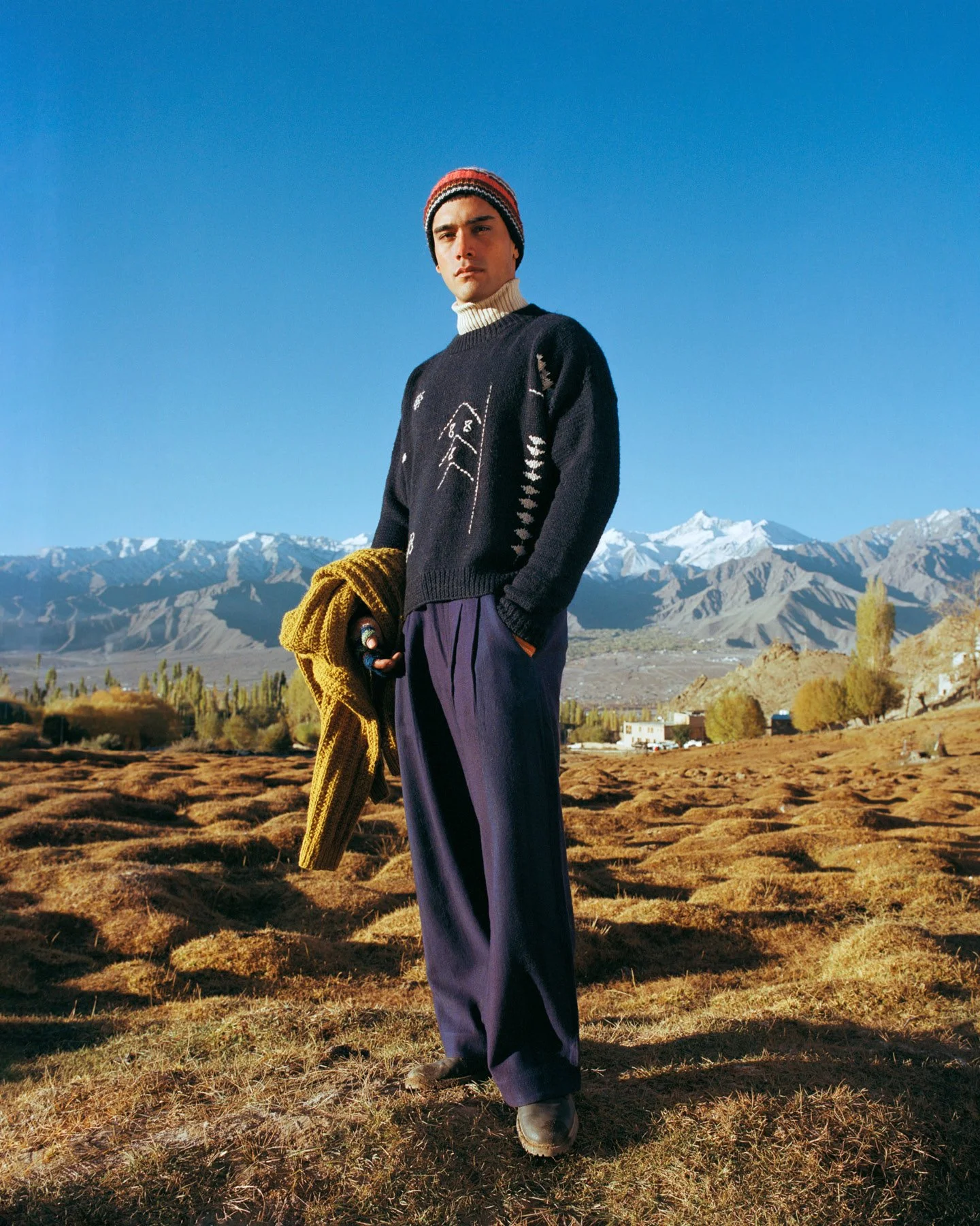 Higher Plains | Royal Enfield x Suket Dhir for Looms of Ladakh *A Limited-Edition Preview * Drawing inspiration from the flora, fauna, and architectural singularities of the Ladakhi highlands, this collection harmonizes pashmina with jamdani techniques. Rendered in earthy hues of Indian madder and marigold, each silhouette carries the warmth of the winter sun.