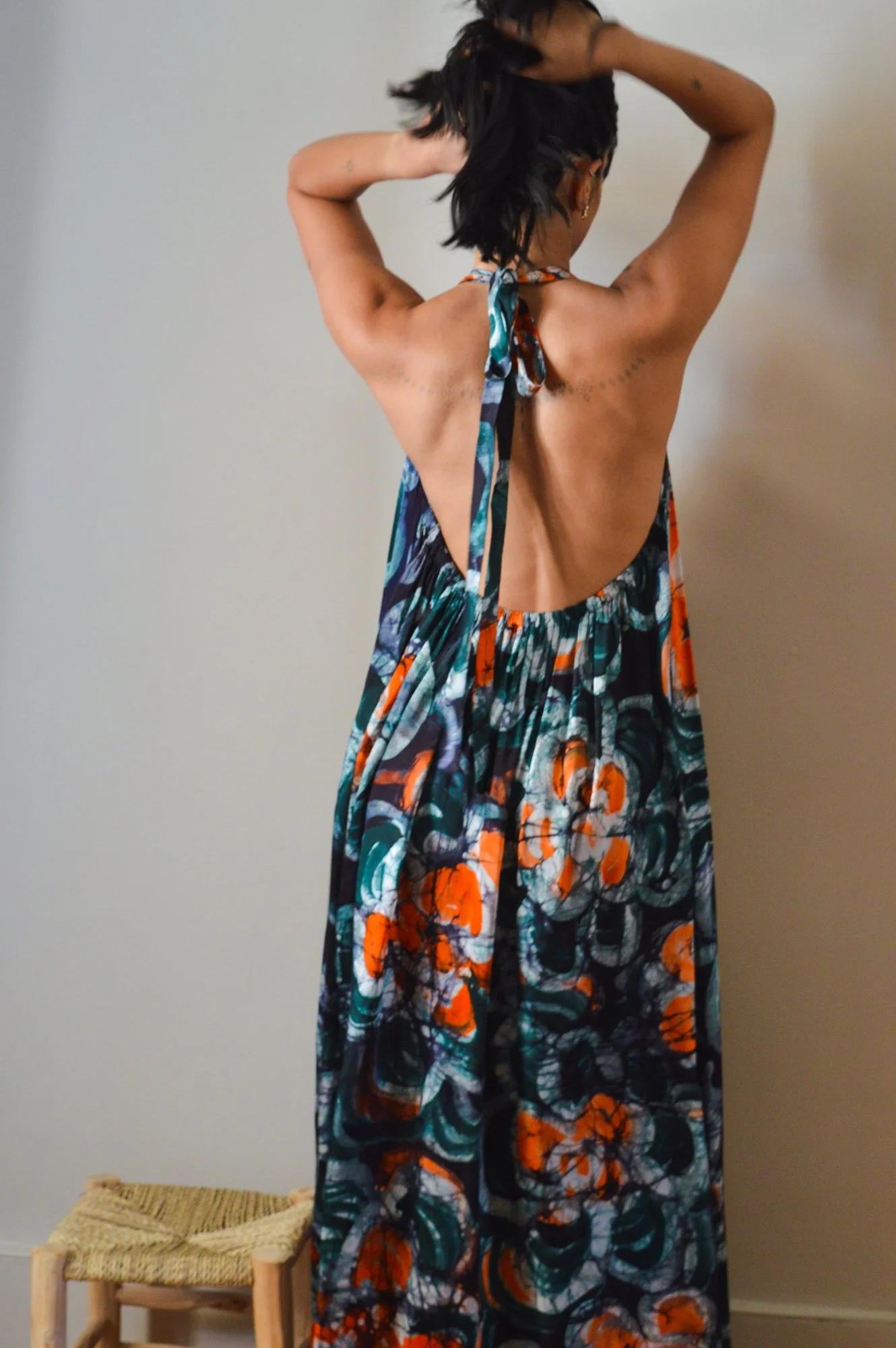 The Miami summer dress is a low back halterneck tie dress. It is made in silk with a full hand batik design. Long and flowing, it is a gorgeous summer dress.